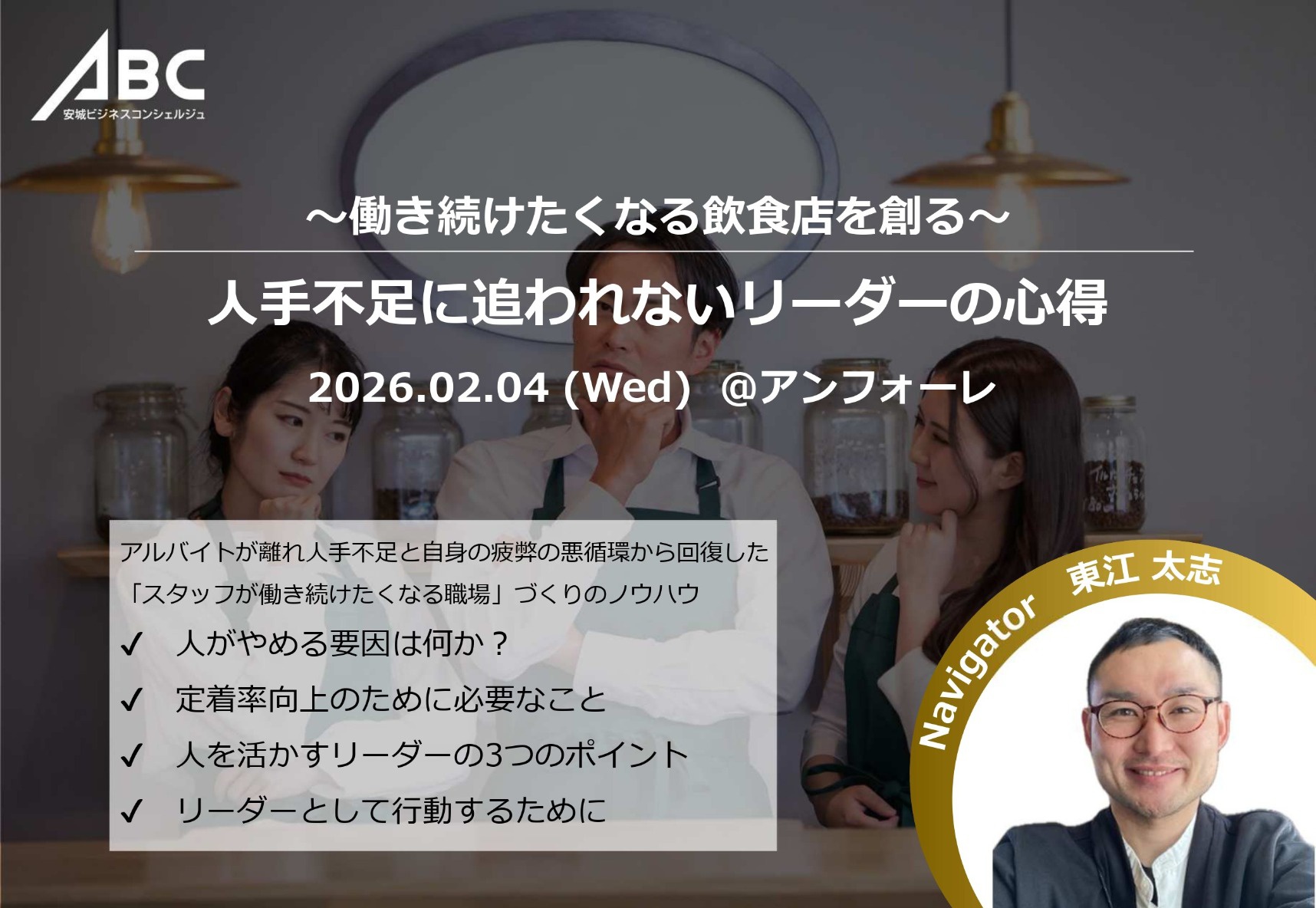 令和8年2月4日(水)14:00~15:30 【~働き続けたくなる飲食店を創る~人手不足に追われないリーダーの心得】 その他 お申し込み 【~働き続けたくなる飲食店を創る~人手不足に追われないリーダーの心得】へのご参加を希望される方は、下記フォームに必要事項を入力してお申し込み下さい。 セミナー/イベント名称 【~働き続けたくなる飲食店を創る~人手不足に追われないリーダーの心得】 お名前必須 ふりがな必須 役職 メールアドレス必須 メールアドレス(確認用)必須 事業所名必須 所在地 〒 都道府県 都道府県 北海道 青森県 岩手県 宮城県 秋田県 山形県 福島県 茨城県 栃木県 群馬県 埼玉県 千葉県 東京都 神奈川県 新潟県 富山県 石川県 福井県 山梨県 長野県 岐阜県 静岡県 愛知県 三重県 滋賀県 京都府 大阪府 兵庫県 奈良県 和歌山県 鳥取県 島根県 岡山県 広島県 山口県 徳島県 香川県 愛媛県 高知県 福岡県 佐賀県 長崎県 熊本県 大分県 宮崎県 鹿児島県 沖縄県 電話番号必須 事業内容